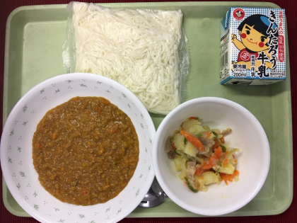 牛乳 麦ごはん 韓国風肉じゃが ナムル風 ナムルに入っている小松菜は東京都の小...