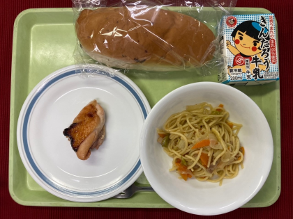 牛乳 ぶどうパン 鶏肉のレモンしょうゆ焼き キャベツのペペロンチーノ 今日の鶏...