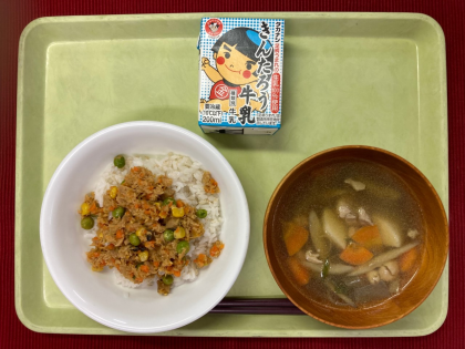 牛乳 ツナ三色丼 いもの子汁 里芋は、皮をむくと、ぬるぬるしたねばりがでてきま...