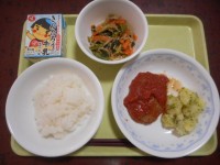 ごはん  牛乳  トマト煮込みハンバーグ  こふきいも   もやしのおか...