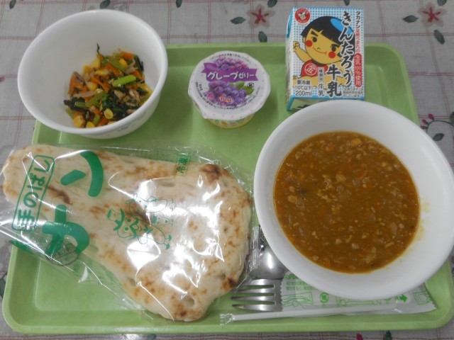 ナン   牛乳   キーマカレー   小松菜とハムのソテー  ぶどうゼリー