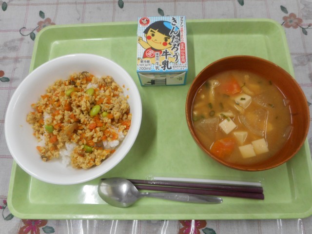 高野豆腐のそぼろどんぶり 牛乳 みそ汁