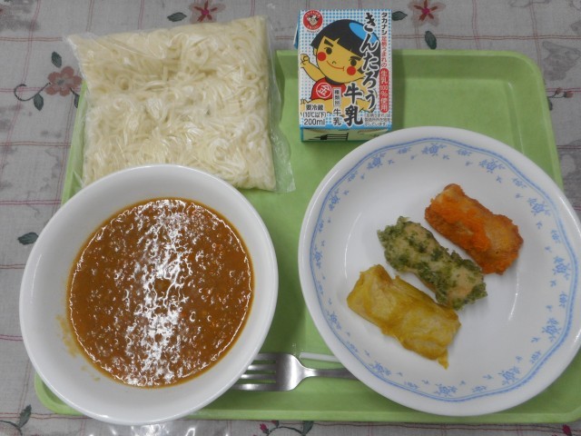 ソフトめんカレーソース 牛乳 ちくわの3色揚げ
