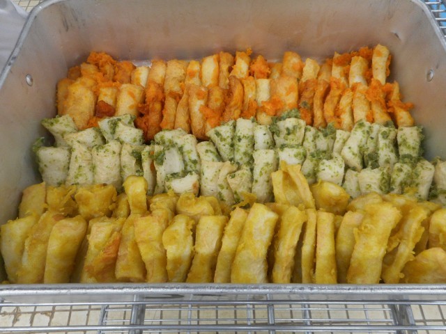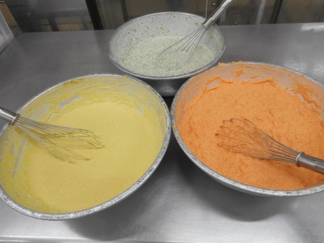 明日は、みんなが楽しみにしている運動会です。今日のおかずは「ちくわの3色揚げ」です。運動会の色と同じ”赤””青””黄”の衣がついています(緑色の衣が青組です)。すりおろしたにんじんをくわえて”赤”、青のりを混ぜて”青”、カレー粉の”黄”です。明日はみんなで仲良く力をあわせて、楽しい運動会になるといいですね。今日の給食もしっかり食べてくださいね。どの色も応援しています!