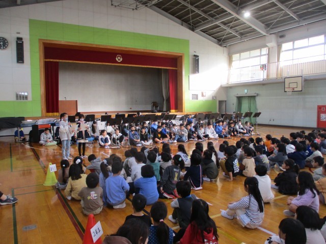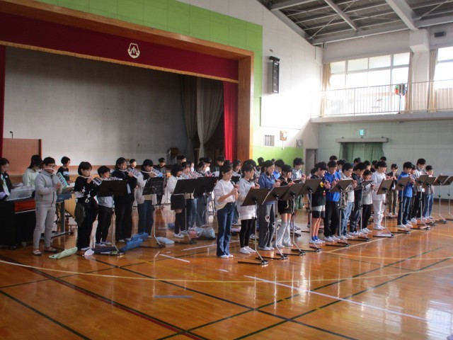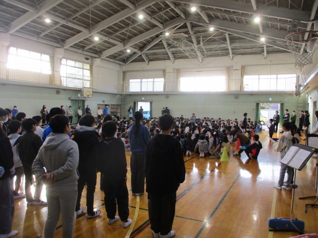 今回は6年生です。「L-O-V-E」の合奏を発表しました。様々な楽器を使用して、素晴らしい音色が体育館に響きました。