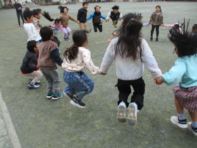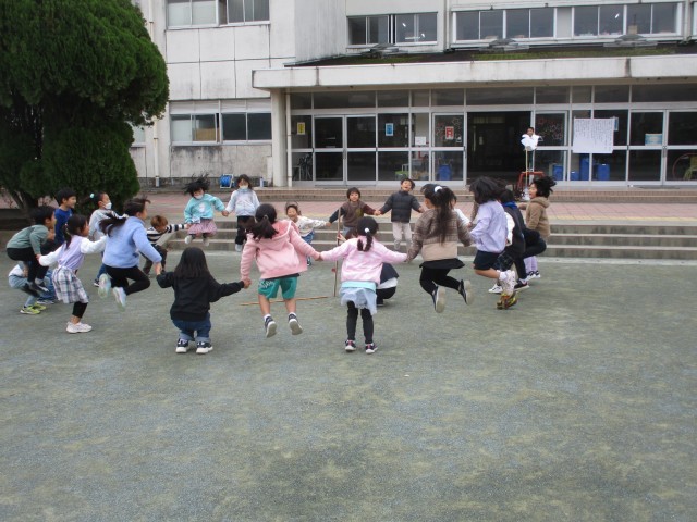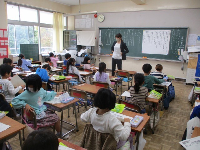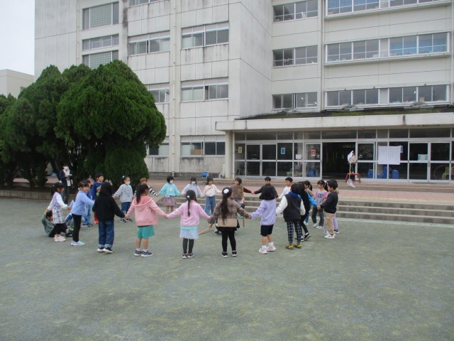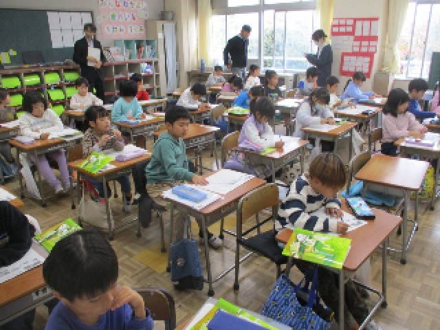 「くじらぐも」の授業を行いました。雲のくじらにとび乗ろうとする子どもたちとくじらの気持ちをより深く考えるために、実際に運動場に出て動作化をしました。教室に戻って、どの子もプリントに考えを熱心に書いていました。