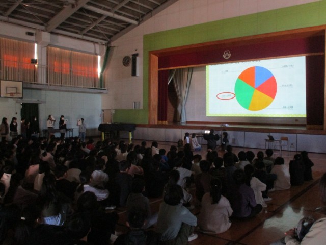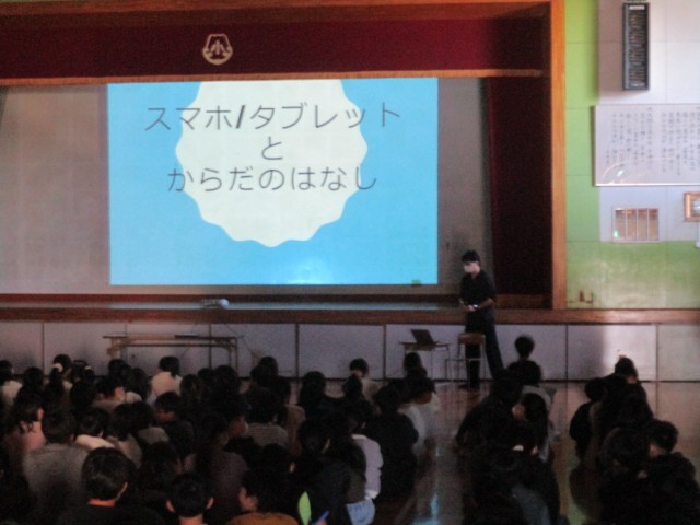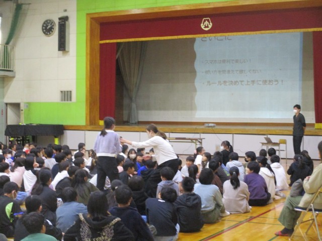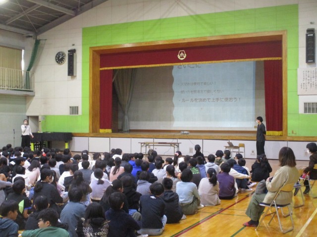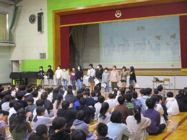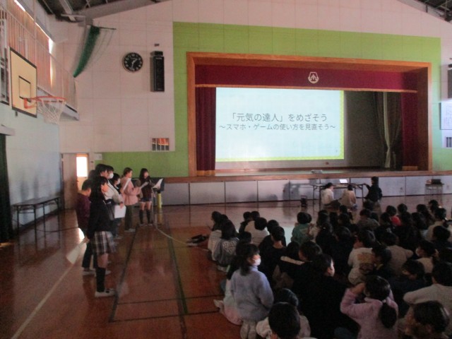 「元気の達人をめざそう 」をテーマにして、スマホ・ゲームの使い方を見直しました。保健委員会の児童がアンケートの結果の発表を行った後、学校医の先生からスマホの使い方で気を付けること等のお話を聞きました。