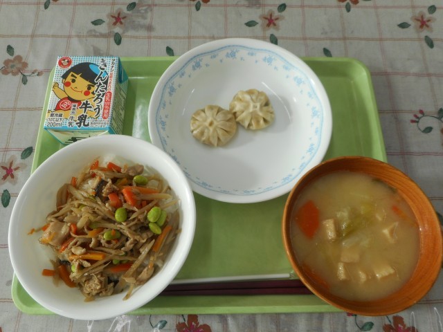 今日のみそ汁には、厚揚げが入っています。同じ大豆製品の油揚げは使うことが多いのですが、厚揚げもおすすめです。汁にこくがでて、ボリュームもアップします。みそ味によく合うので、ご家庭でもお試しください。3品メニューの今日は、おかずに「にらまんじゅう」がつきました。にらがたくさんはいっている点心です。子どもたちにもとても人気がありました。