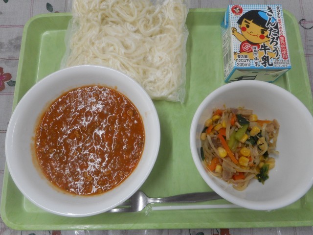 ソフトめんミートソース   牛乳   もやしのごま炒め