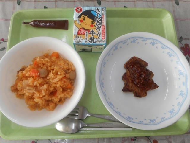 牛乳 ミルメークココア チキンピラフ もみの木ハンバーグのデミグラスソース