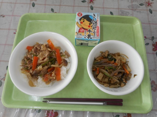 スタミナどんぶり  牛乳  糸昆布の煮物