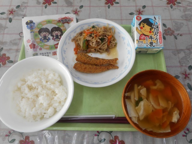 今日は節分です。いわしを食べて鬼を追い払い、恵方巻を食べながら願い事をしましょう。すまし汁に入っているのは『ゆば』です。『ゆば』は大豆から作られる栄養満点の食べ物です。6年生が修学旅行で行く日光市の『ゆば』は、豆乳を沸騰させたときにできる膜を真ん中から二重に引き上げて作ります。ボリュームがあって、とてもおいしいので有名です。今日の『ゆば』も日光産です。味わって食べてみてください。