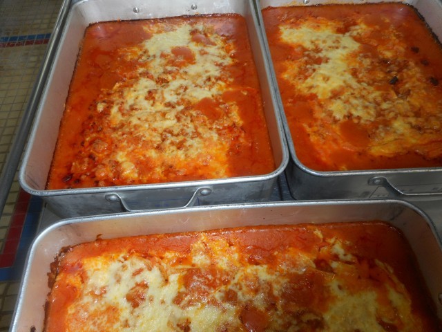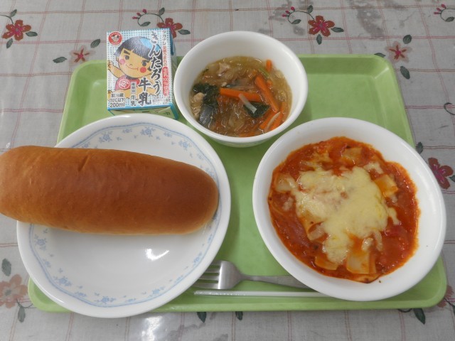 年末のリクエストアンケートで、お肉のおかず部門で2位だった「ラザニア」です。全校で96人からリクエストがありました。ひき肉にトマト味がからまって、もっちりしたパスタ(給食ではワンタンの皮で代用ですが…)の食感はグラタンとは違った味わいです。具の中と上にかかったダブルチーズが、おいしさを引き立てています。オーブンで焼き上げたあつあつを食べられるのも魅力ですね。味わって食べてください。