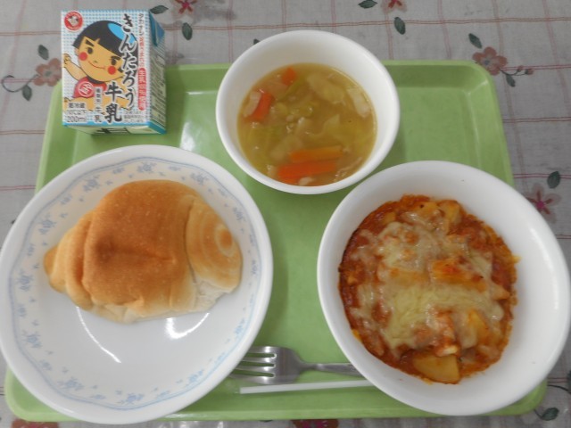 米粉ロールパン 牛乳 ポテトのミート焼き お豆ときゃべつのスープ