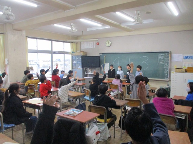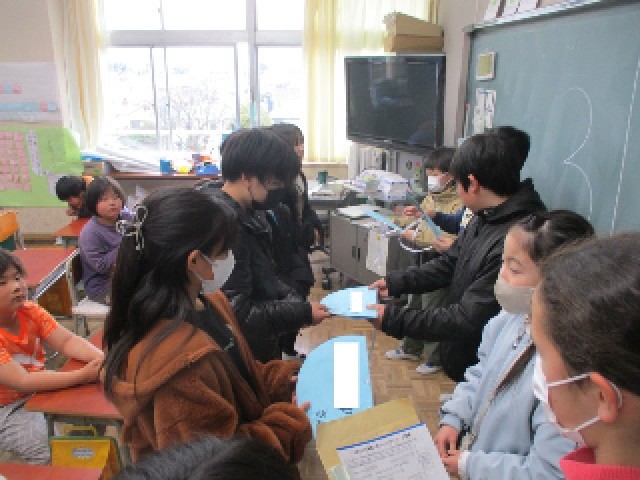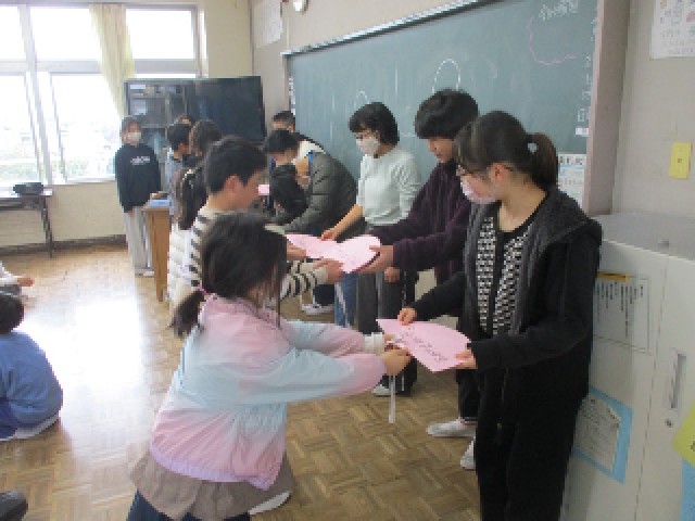 本日のなかよしタイムは、5年生が進行をしました。遊びは4年生が担当し、班ごとに様々な室内遊びに取り組みました。最後に一年間お世話になった6年生にメッセージを渡しました。