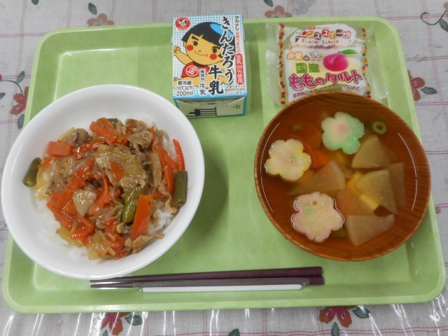 豚肉どんぶり 牛乳 お花のすまし汁 桃のタルト