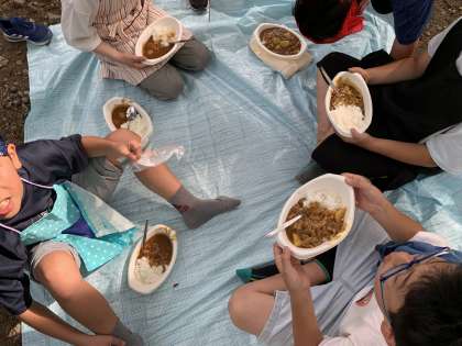 (おこげはご愛嬌)子どもたちはカレーの美味しさに舌つづみ。