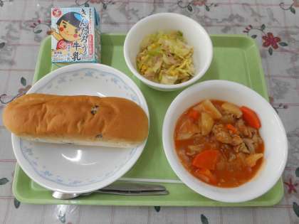 ぶどうパン 牛乳 鶏肉のトマト煮 きゃべつとツナのソテー