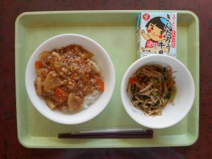 牛乳・豚肉と大根のピリ辛煮丼・もやしと青菜のおかか炒め