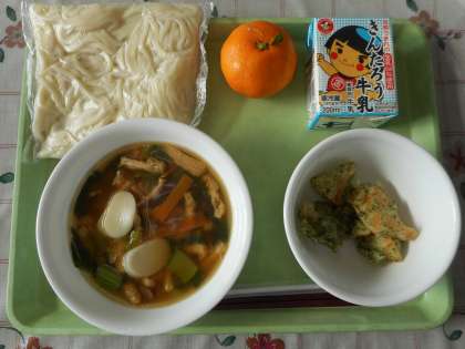 力うどん 牛乳 ちくわの磯辺揚げ 果物(みかん)