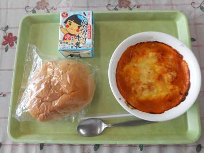 ころっと丸い形のパンだと食べやすいかと今日のぶどうパンは丸型にしてみました。高学年のパンはかなり大きく感じました。おかずは子どもたちが大好きなラザニアです。こんな暑い日でも好きな物はおいしくいただけますね。バットについたチーズまできれいにとって食べてくれていました。毎日暑い中で給食を作ってくださっている調理員さんたちですが、空っぽの食缶がもどってくるとみんな元気いっぱい笑顔になれます。
