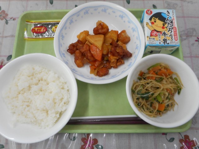 今日のおかずの「揚げ鶏の中華風煮」は、酢豚の鶏バージョンのような料理です。味付けの仕上げにお酢を使っています。食缶のふたを開けたとたんに「いいにおい~!」と感じた子もいました。これからの暑くなる季節には、香辛料や酸味などのきいた料理がおいしく感じられます。お肉や野菜が一緒に食べられる、今日のようなメニューはおすすめです。ご家庭でもお試しください。