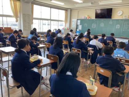 昨日から給食が始まりました。1年生にとっては、中学初めての給食でしたが、わりとスムーズに準備ができていました。味はどうでしたか?全員前向きの黙食は、しばらくの間は続きますが辛抱してください。メニューは、湘南ゴールドジュース、麦入りご飯、鶏肉の香り揚げ、すまし汁でした。今日は特別の入学進級お祝い給食でした。