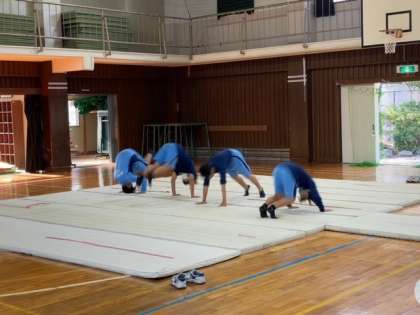 2年生体育の授業、器械体操やってました。マットや跳び箱を自由に使い、3〜4人一組となり、自分達で決めた曲、自分達で考えた演技構成で演技発表していました。見ていた側も演技した生徒も笑顔になれる良い授業でした。