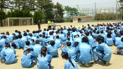 写真(中)(下)は、体育科の角田先生からの具体的な注意事項を話しているところです。真剣に聞いている白鴎中生徒の後ろ姿は輝いています。でもグラウンドの小石と…ではなく小石で遊んでいるのが、1年生男子に数名いました。本当に「まだ中学生になりきっていない」というのがよくわかります。
