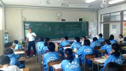 写真(下)が1年2組の数学の授業です。正負の数の加法の学習です。写真では、左端に小林先生がいて、あたたかい視線とともに黒板の前で説明している金子くんの話を聞いています。正負の数というと、私は中学生の頃「マイナスとマイナスをかけるとなぜプラスになるのか?」がよくわからず、数学の先生にも質問できず、悶々とした日々を送ったのを思い出しました。