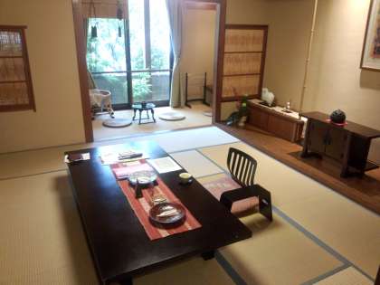 写真は今日の宿のお部屋です。12畳をこえる広々とした部屋で、私の部屋には露天風呂もついてます。