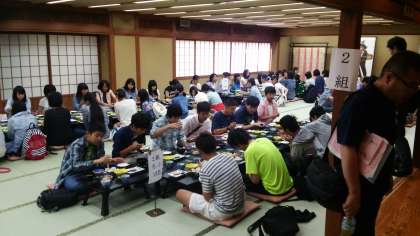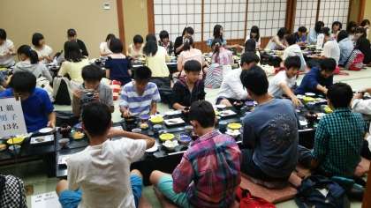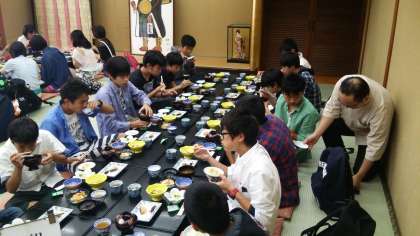 写真は、今日の給食ではなく、旅館での朝食です。もちろんごはんは"おかわり自由"です。バイキングではなく和食です。