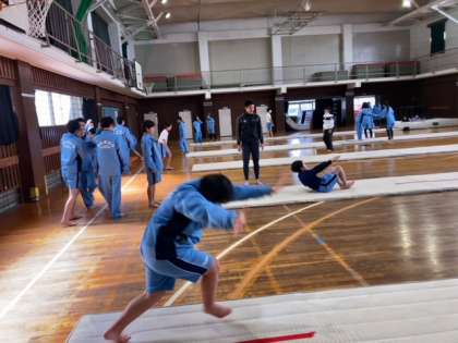 上の写真は、1年生マット運動の授業です。前転、後転、ハンドスプリングなど様々な技に挑戦していました。下の写真は、3年生音楽の授業です。約1ヶ月後の卒業式で歌う曲の練習をしていました。練習の曲を聴いているだけで、何となくウルウルしてしまいました。