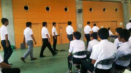 写真(中)(下)にはバレーボール専門部長の小林先生の姿があります。優勝杯を受け取るために、演台に向かって歩いているところです。昨年度は白鴎中は単独チームでの優勝がなかったので、優勝杯返還に白鴎中は登場できませんでした。連合チームで昨年度関東大会に行ったソフトボール部が、今年は単独チームでも優勝し、県大会、関東大会、全国大会へと勝ち進むことを期待しています。もちろんそのほかの部でも。