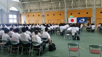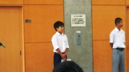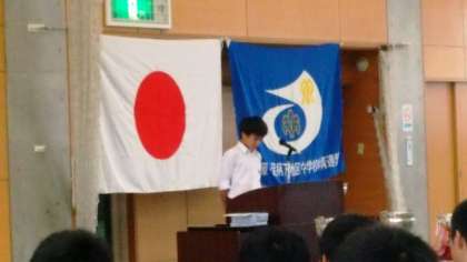 写真(上)と(中)は、白鴎中の「学校紹介」をしているサッカー部の星野くんです。写真からも緊張しているのがよく分かります。星野くんは『白鴎中は“さとく、美しく、たくましく”を校訓とし、日々学校生活を送っています。全校生徒は296人おり、部活動は運動部9つ、文化部3つあり、毎日積極的に活動しています。白鴎中では、年に7回海岸マラソンをしています。通称“海マラ”は、62年間も続く伝統的な学校行事です。約1.3キロを走り、全校生徒の体力向上につながっています。そういった学校行事や日頃の練習の成果を出し切れるように、精一杯がんばりたいです。僕の所属するサッカー部では、まずは地区大会をしっかりと勝ち抜き、“県西大会優勝”を目標に、みんなの気持ちを一つにして練習に取り組んできました。僕は主将としてみんなをまとめ、仲良く、楽しんで、悔いのない最後を迎えられるようにしたいです。』と堂々と言ってくれました。