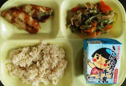 今日の給食のメニューは、鰺の蒲焼き梅風味、野菜炒め、さくら飯、牛乳です。