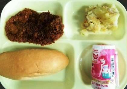 今日の給食のメニューは、トンカツ、ジャーマンポテト、コッペパン、ジョアです。