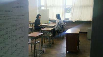 写真(下)は、笑顔で面談をしている2年1組担任の角田先生です。やはり笑顔は大事で、安心感を与えます。「和顔愛語」を実践してくれているところがすばらしいです。