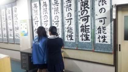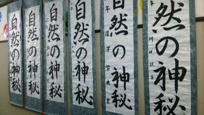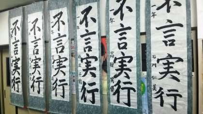 写真は、職員室前の廊下に掲示してある各学年で選ばれた「書」です。こんなに上手に書けるってすごいです。私は小さいときから字が下手で、特に毛筆で字を書くのが苦手でした。今でも苦手のままです。新年に自分の書いた“書き初め”を教室に張られるのが嫌で嫌で…。職員室前に掲示してある「無限の可能性」「自然の神秘」「不言実行」…どの字もすばらしく、うらやましく思います。