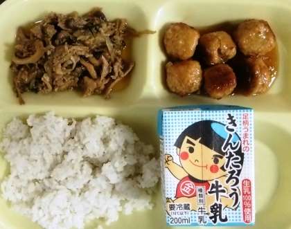 今日の給食のメニューは、スタミナ丼、肉団子の甘酢あんかけ、牛乳です。