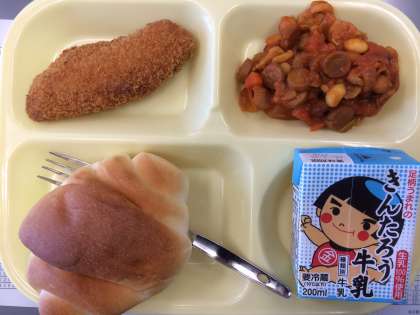 今日の給食のメニューは、チリコンカン、チーズ入りささみフライ、米粉ロールパン、牛乳です。