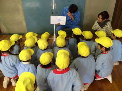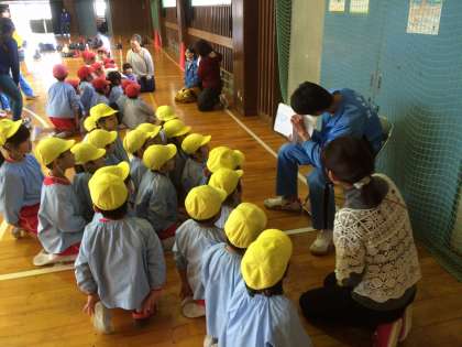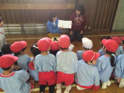 何と、昼休みに体育館に来た3年生が、自作絵本を読み聞かせしていました。渡邉先生が午前中に保育学習をした3年生に声をかけたら、「自分が遊んだ子たちに読んであげたい」と言って、3年2組の城田くんが来てくれました。また、同じく2組の秋山さんも読み聞かせをしてくれました。