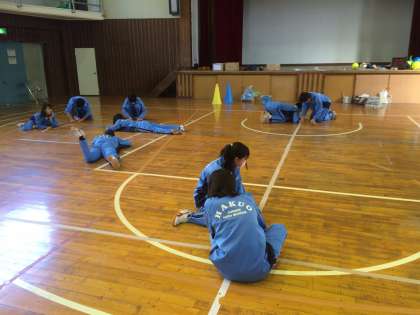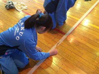 本日の保育学習の最終活動は、体育館の掃除です。さすが3年生、みんなが体育館の床に座り込んで、床に貼られた表示やテープなどをはがしていました。当たり前のことですが、生徒一人残らず全員が、最後まできちんとできる白鴎中学校の生徒は、素晴らしいと思います。