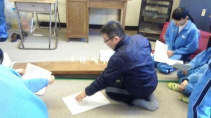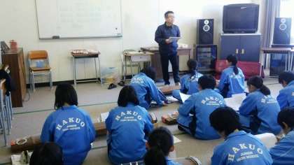 写真は、今日の3校時、2年1組の音楽の授業風景です。今日は視聴覚室で、「箏」の授業です。植田先生の説明にじっくり聞いている2年1組の生徒たちの後ろ姿は“もうすぐ3年生になる…”という自覚の表れがよくでていました。