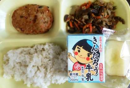 今日の給食のメニューは、野菜入り照り焼きハンバーグ、きんぴら、麦ご飯、カットフルーツ、牛乳です。