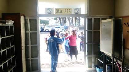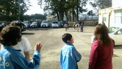 写真は、玄関で「さよなら〜」「また会おうね」と声をかけているところです。