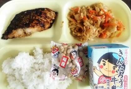 「節分献立」の今日の給食のメニューは、鰆の香味焼き、切り干し大根の煮物、ご飯、福豆、牛乳です。