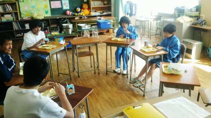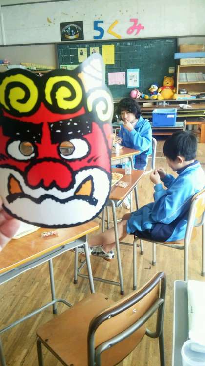 写真は、5組の給食風景です。大塚先生が買ってきた“赤鬼”の面で「鬼は外、福は内」とやってしまったあとでした。「なんで“鬼は外”って言うのか?」を5校時の授業で調べ学習をするといいのですが…、今日の5組の5校時は「作業」の時間です。