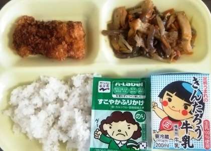 今日の給食のメニューは、イカのフライ、蒟蒻のきんぴら、麦ご飯、ふりかけ、牛乳です。