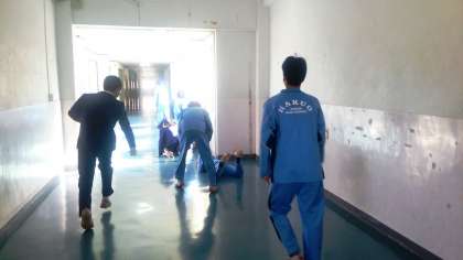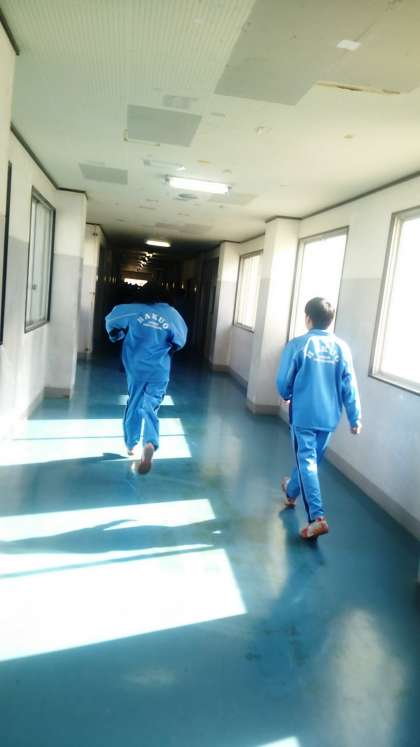 写真(上)は、北館1階にいる3年生が、南館2階に避難しているところです。窓から姿が見えないように、身体を屈んで窓の前を通過している生徒もいます。